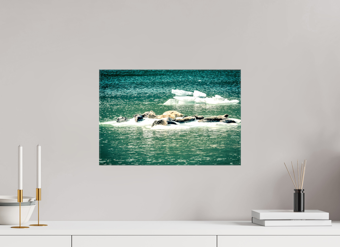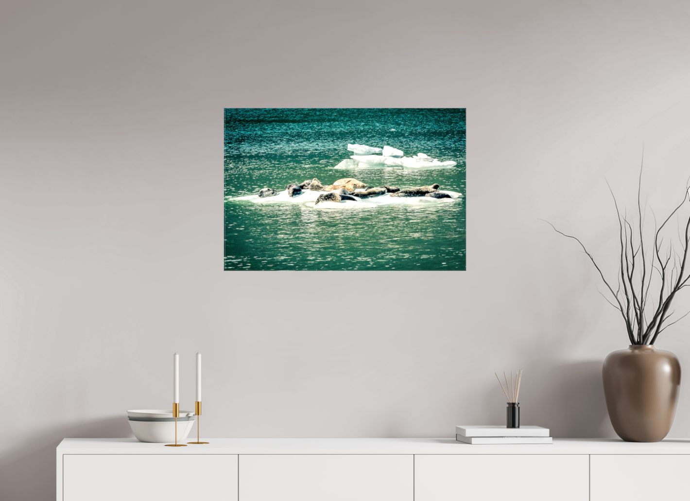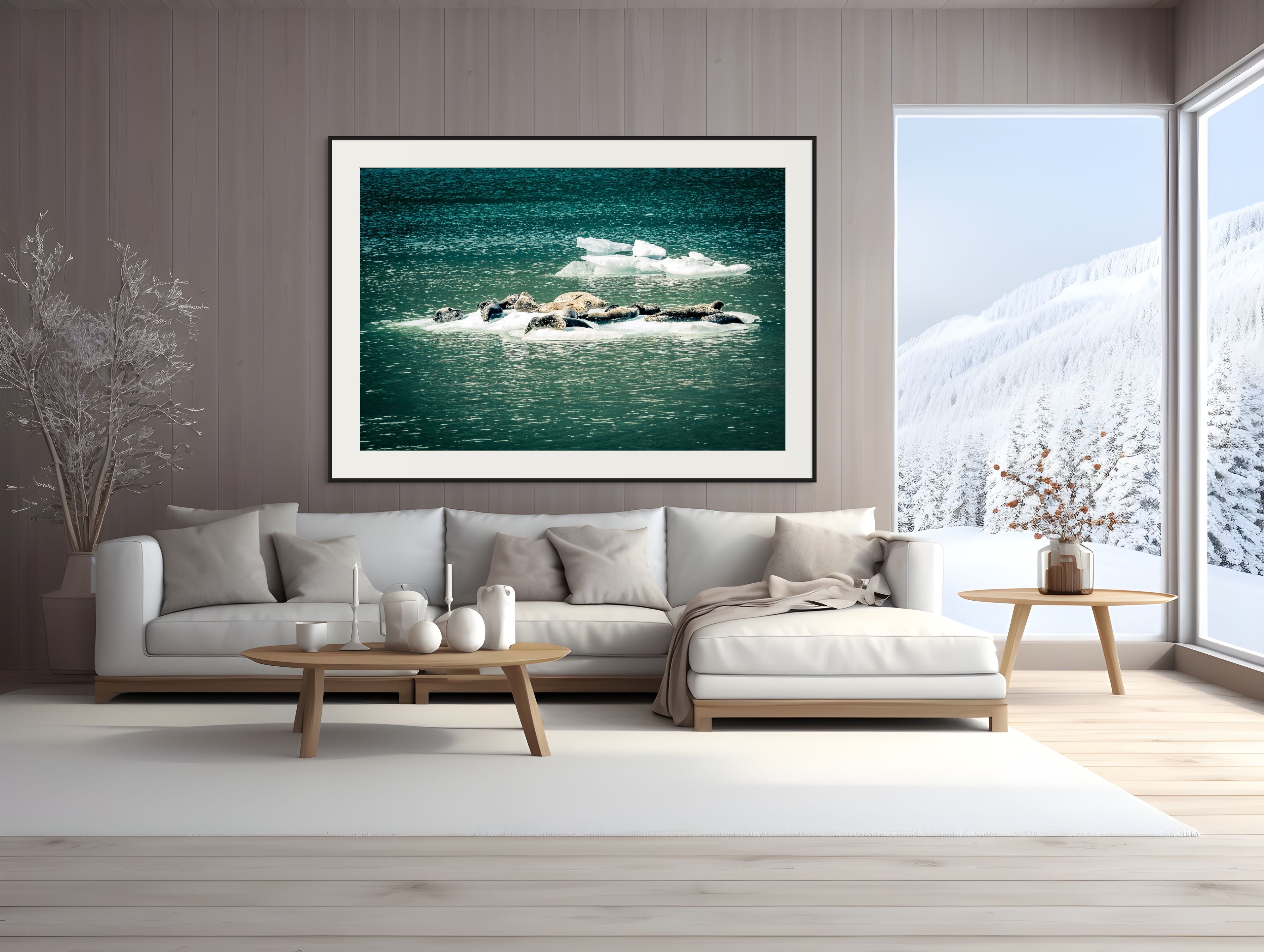 Experience the serene beauty of nature with our stunning Sunbathing Seals fine art print. Captured during an unforgettable journey to Sawyer Glacier, this photograph features a delightful scene of seals basking in the sun, with one captivating seal looking directly at the camera, inviting you into its tranquil world.