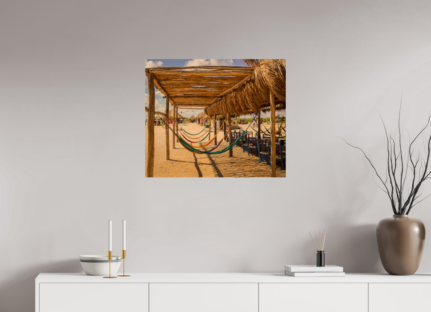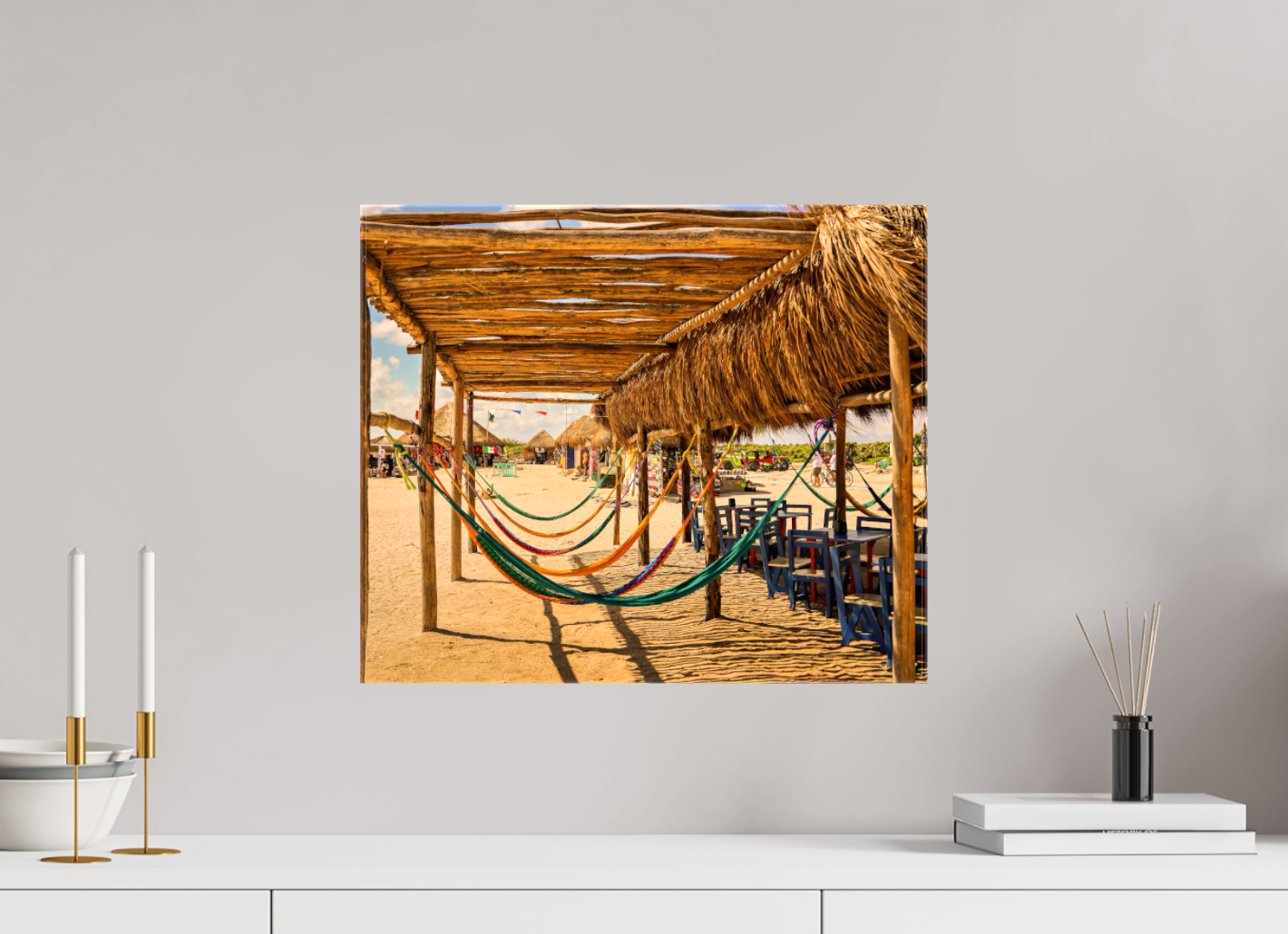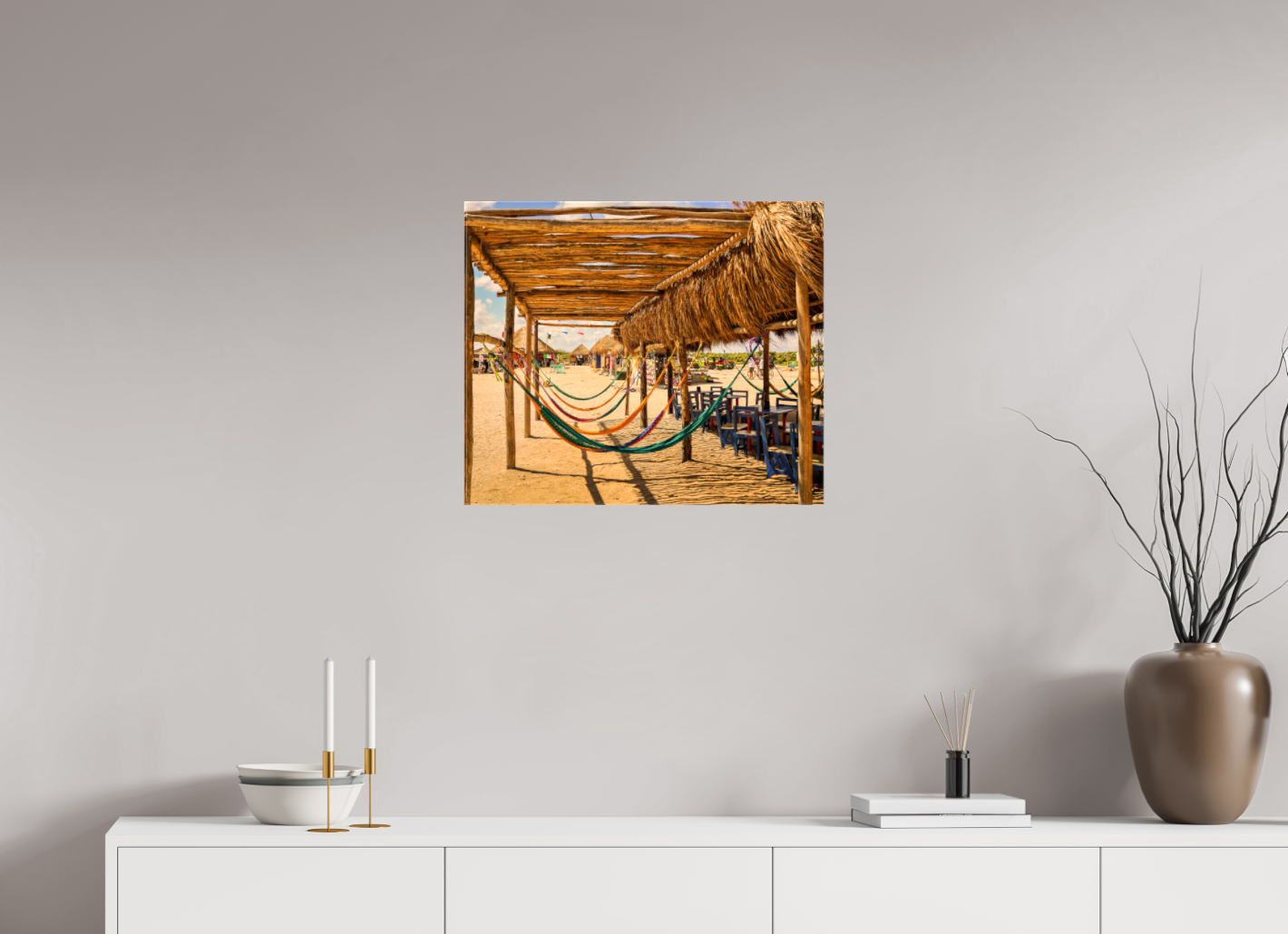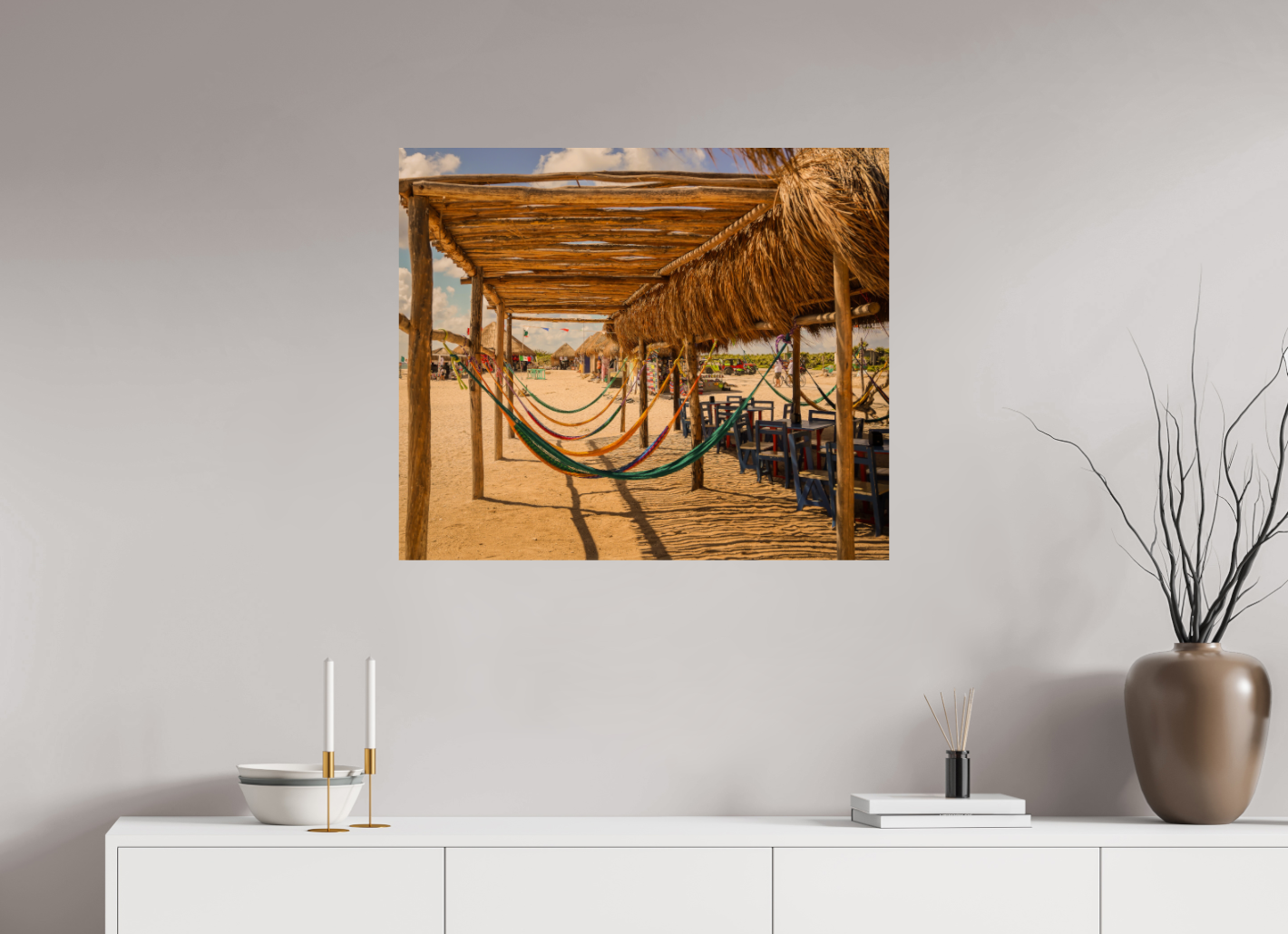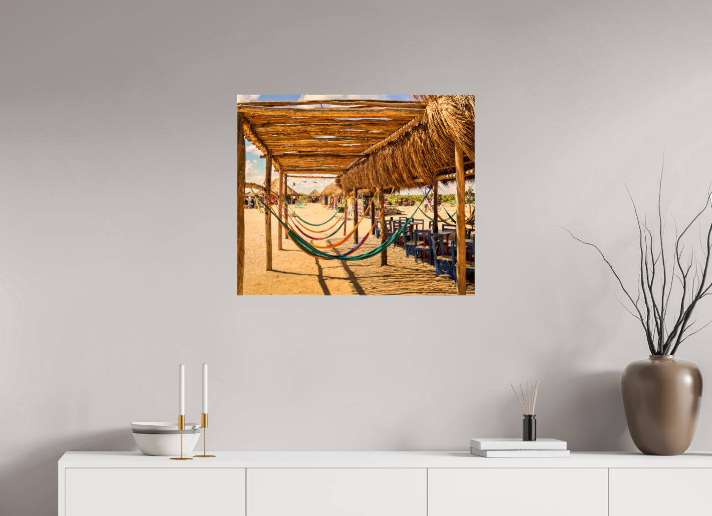 Hang this stunning artwork in your home, office, or beach house to evoke the relaxed vibe of hammocks on the beach every day. This print makes a perfect gift for travel enthusiasts or anyone who cherishes coastal escapes.
