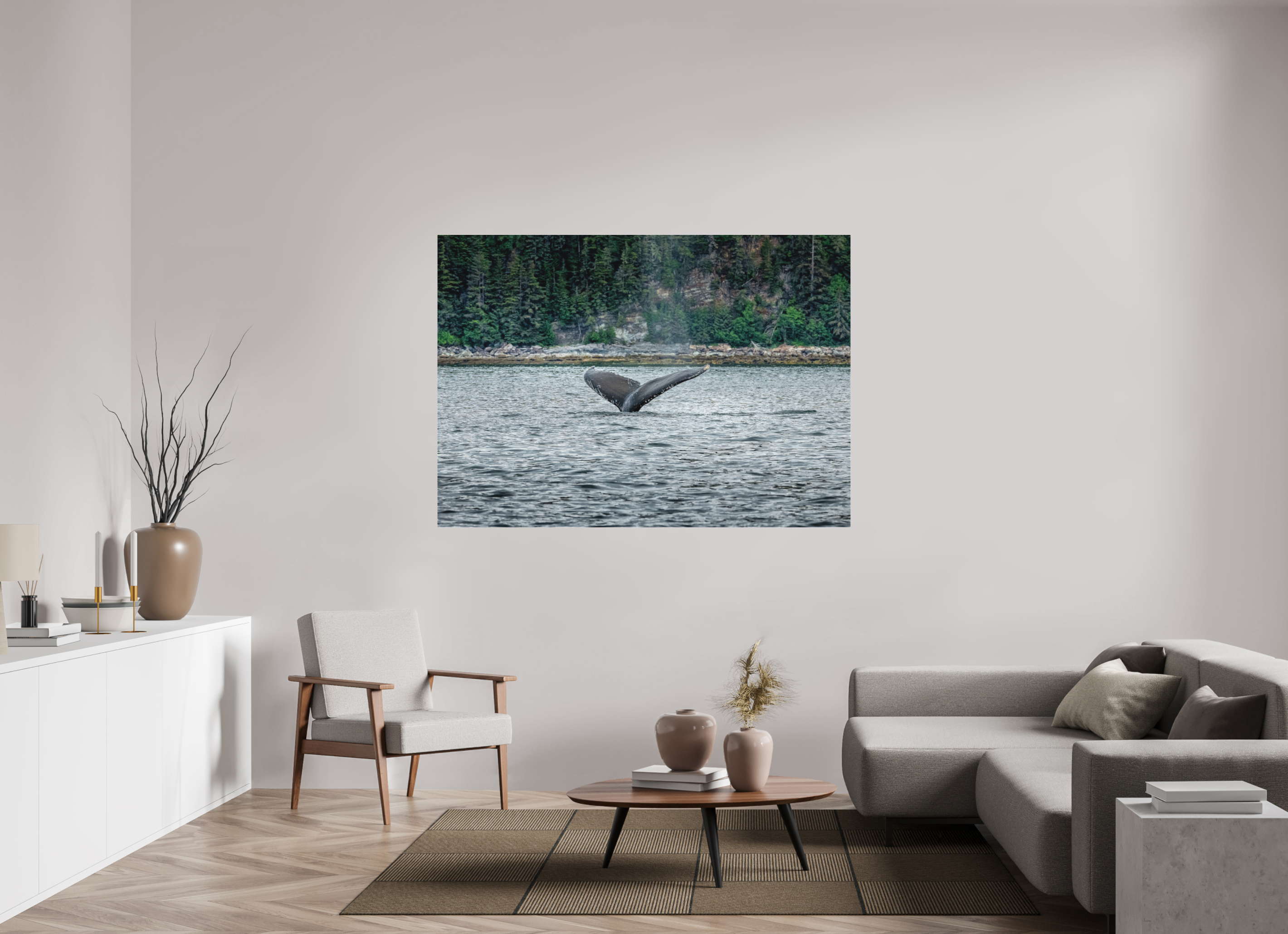 Transform your living space with the enchanting beauty of the Graceful Entry - Large Print. This stunning large print photograph captures the breathtaking moment a majestic whale gracefully enters the waters off Juneau, Alaska. The image freezes the tail's last glimpse, showcasing the raw power and elegance of nature in one extraordinary frame.