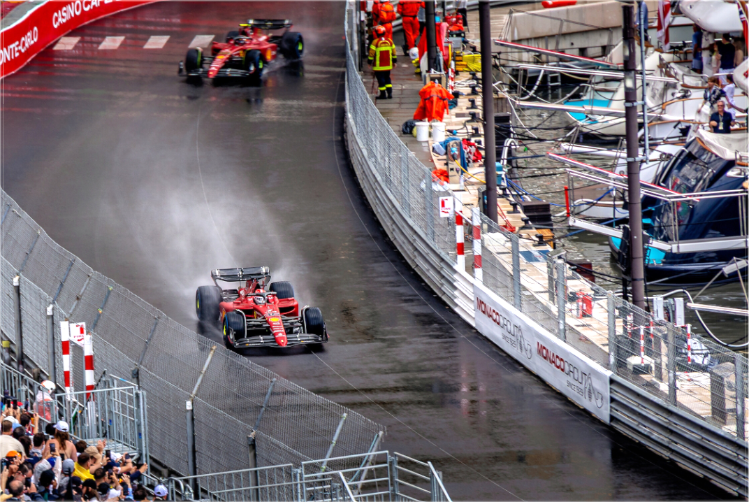 Experience the exhilarating moment when LeClerc leads the Pack during the iconic 2022 Monaco Grand Prix with this stunning fine art print photography. This breathtaking piece captures the thrill of the formation lap as the two Ferraris glide gracefully through the picturesque harbor, surrounded by enthusiastic fans and the stunning backdrop of the grandstands.