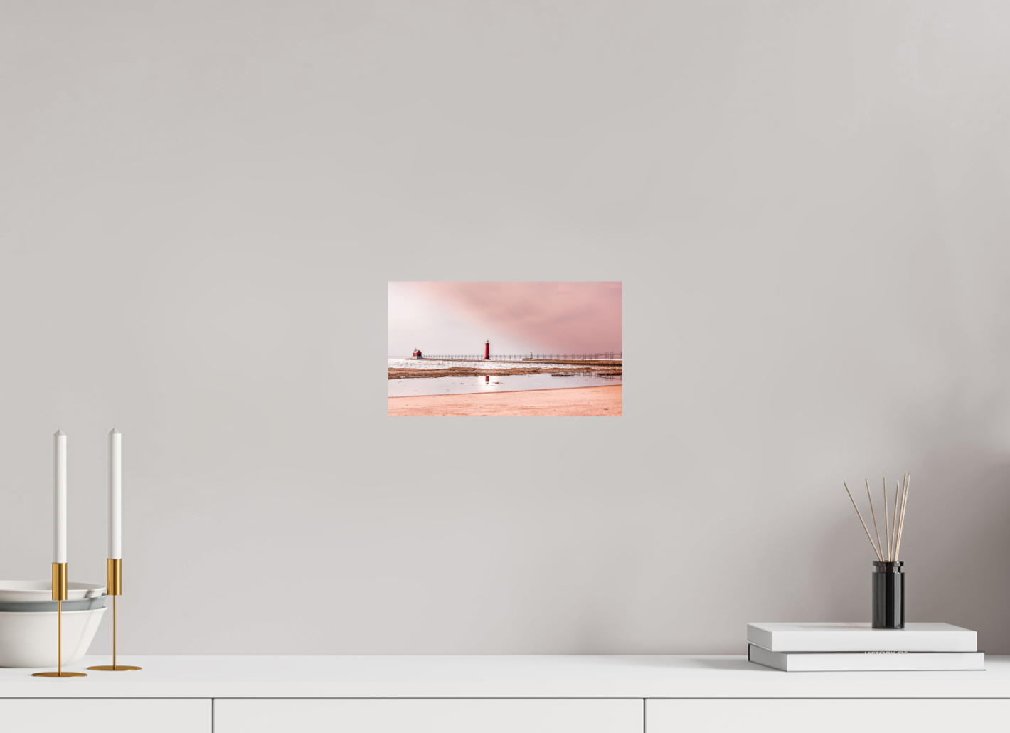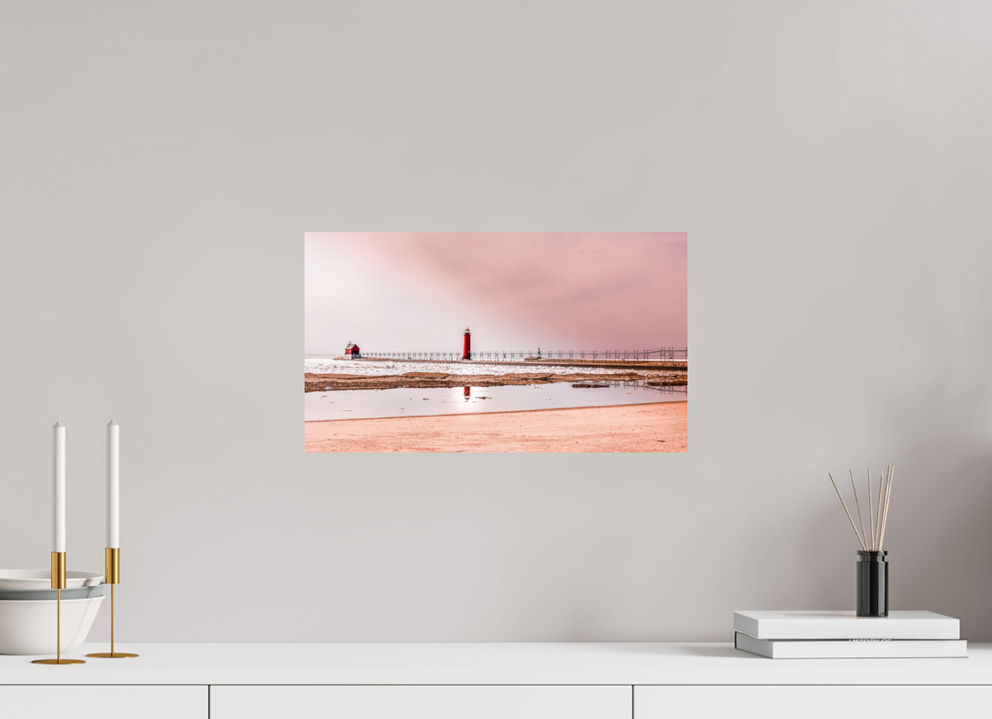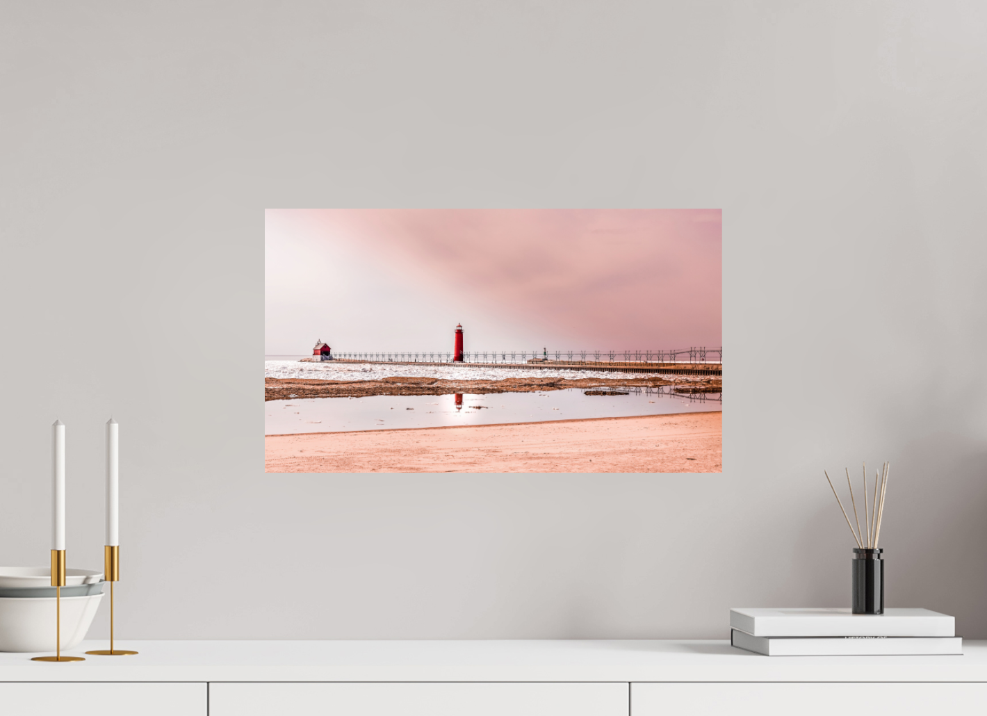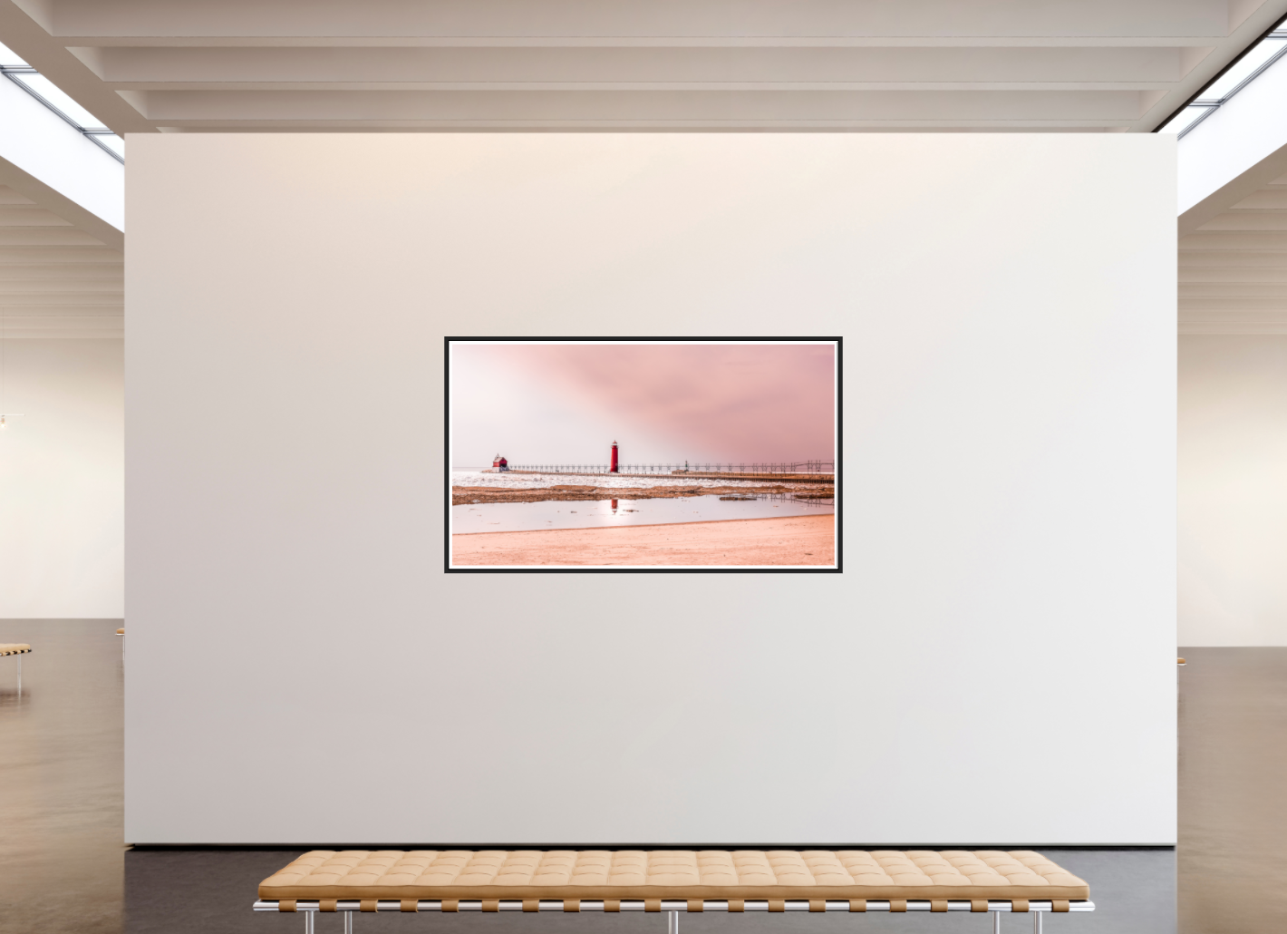 Immerse yourself in the serene beauty of the Grand Haven Pier with our stunning Fine Art Print photograph. Captured on an artistic, overcast day, this medium format image showcases the captivating interplay of frozen lakes and the gentle warmth of the beach as winter begins to melt away.