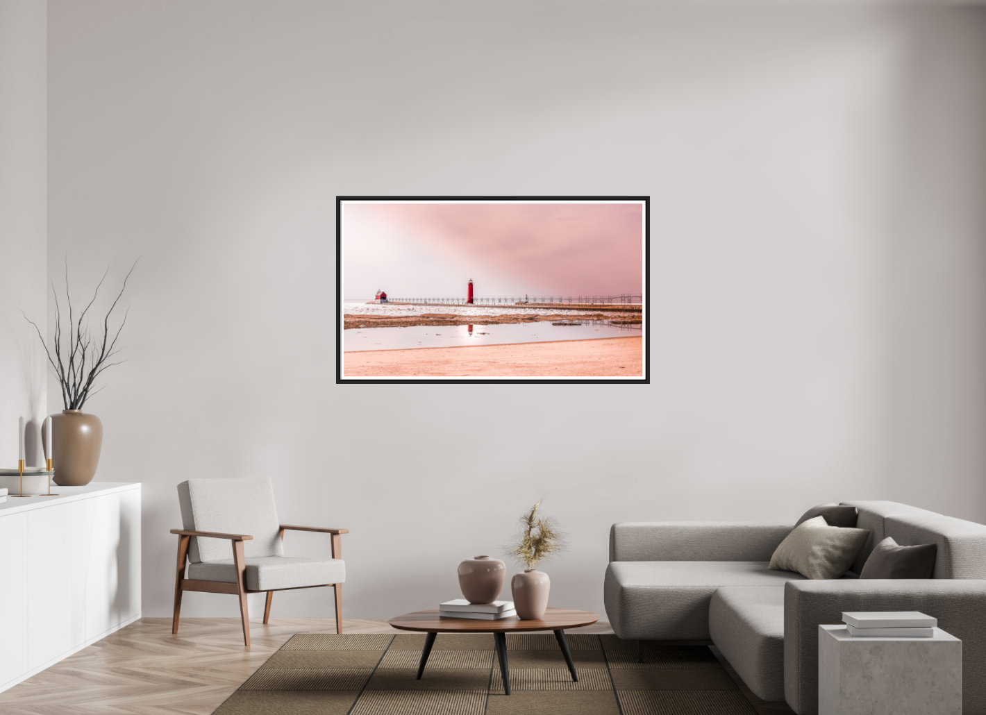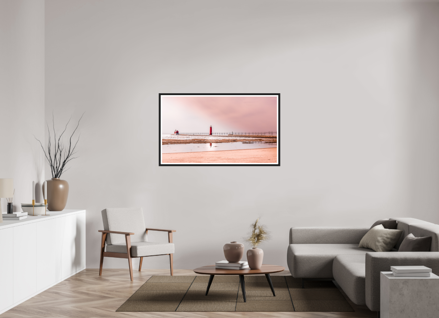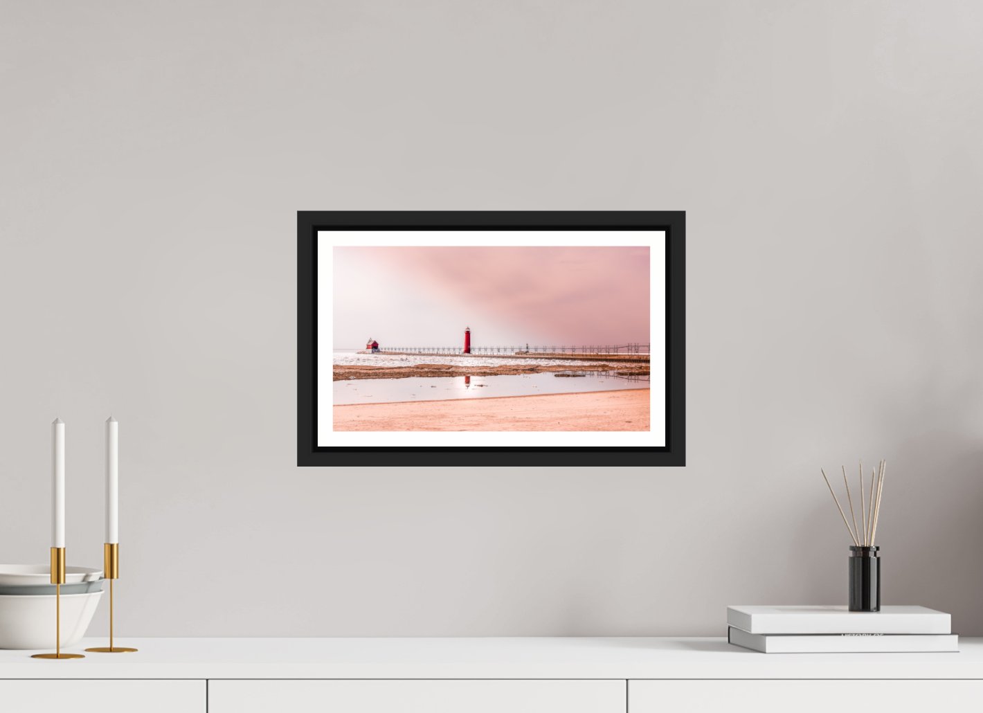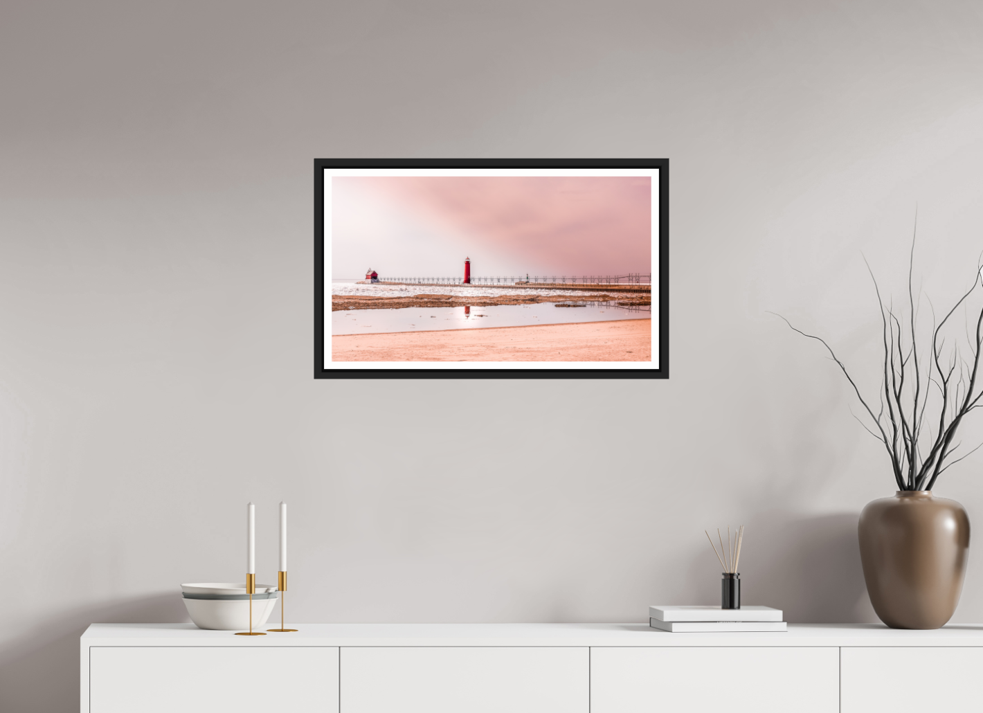 Immerse yourself in the serene beauty of the Grand Haven Pier with our stunning Fine Art Print photograph. Captured on an artistic, overcast day, this medium format image showcases the captivating interplay of frozen lakes and the gentle warmth of the beach as winter begins to melt away.