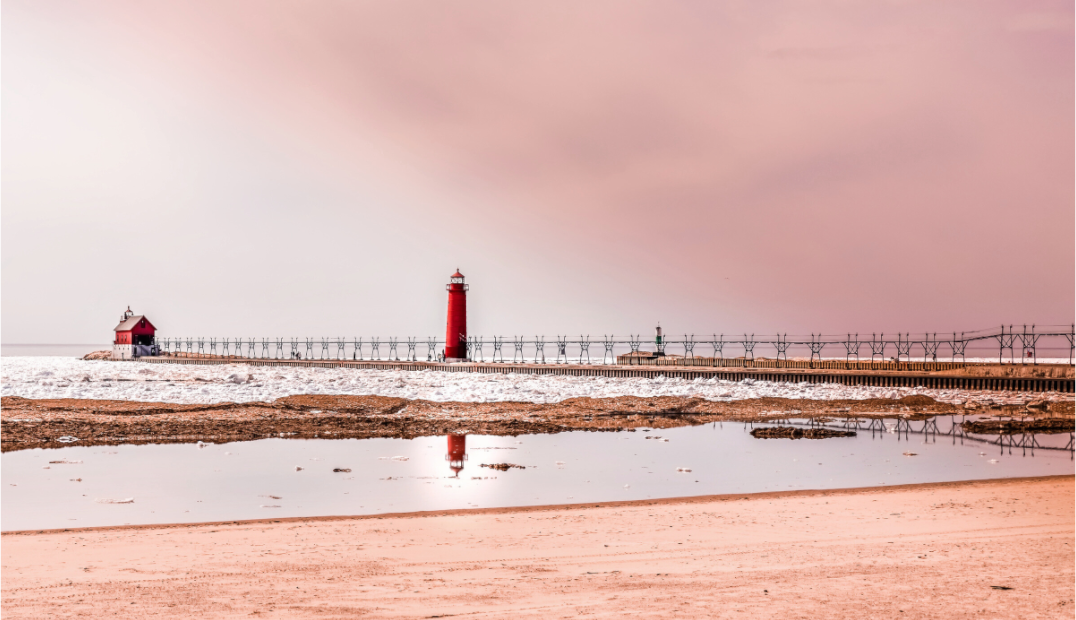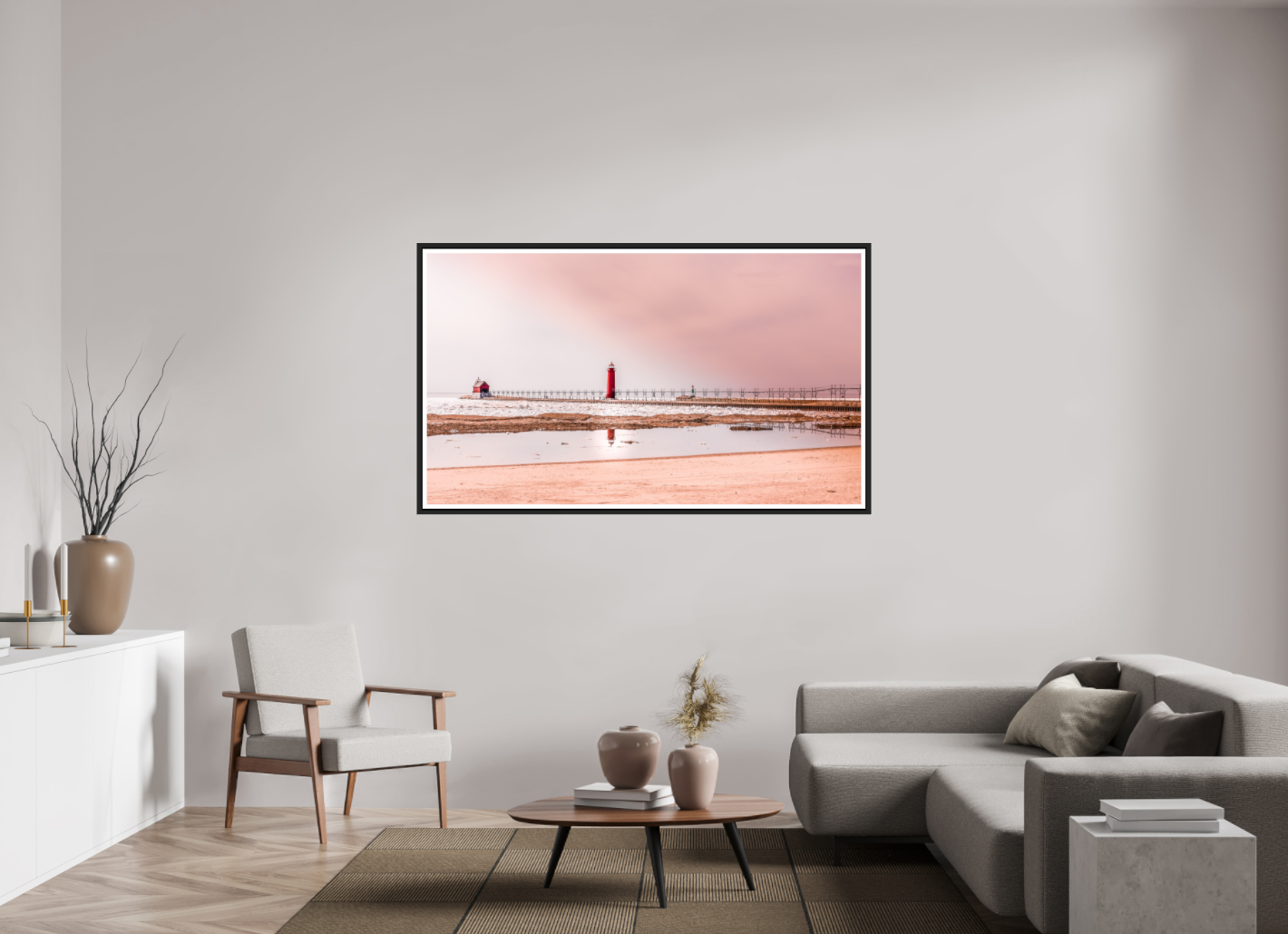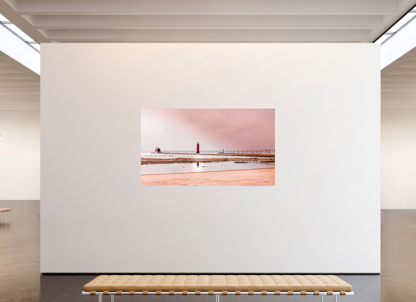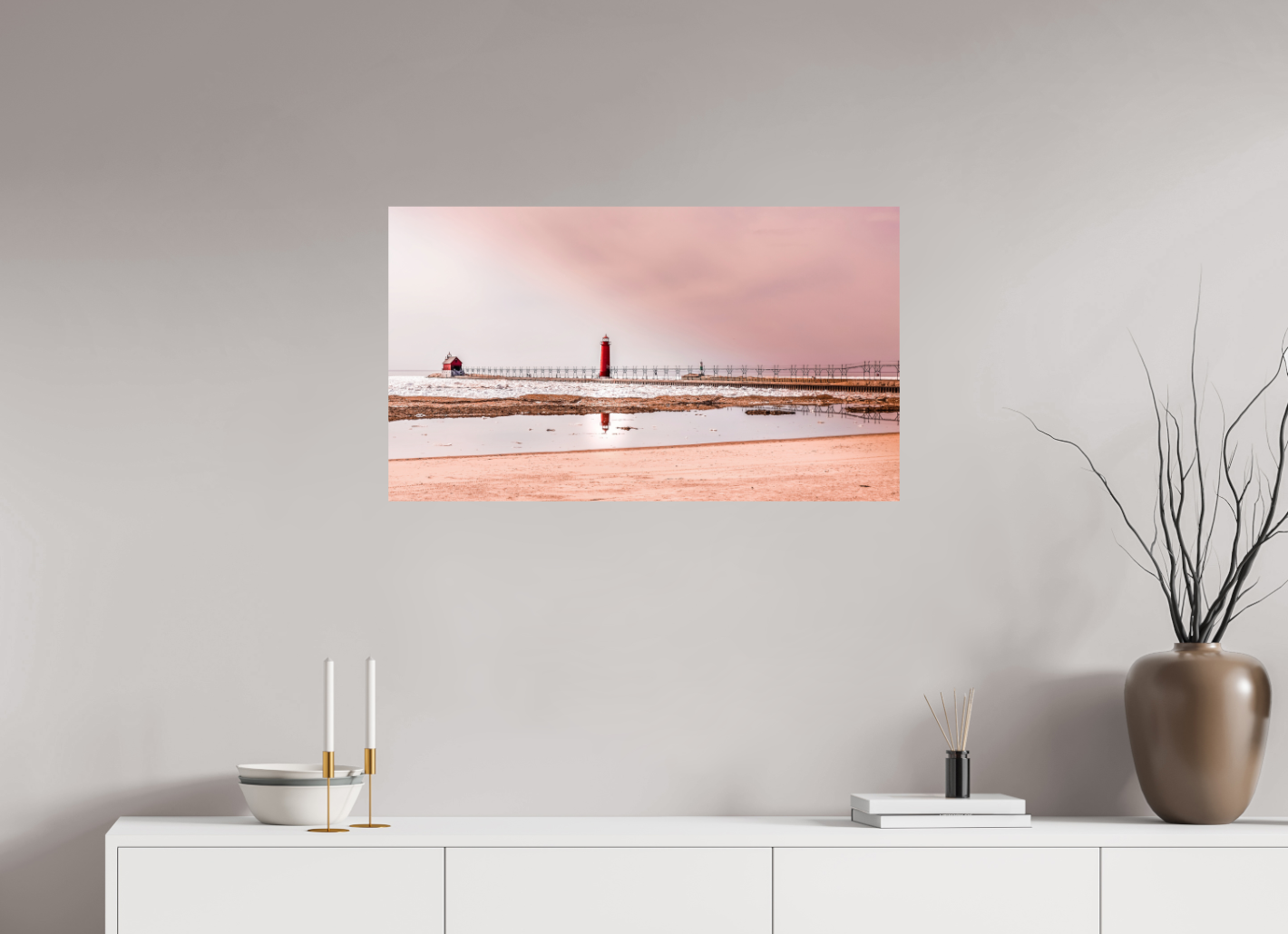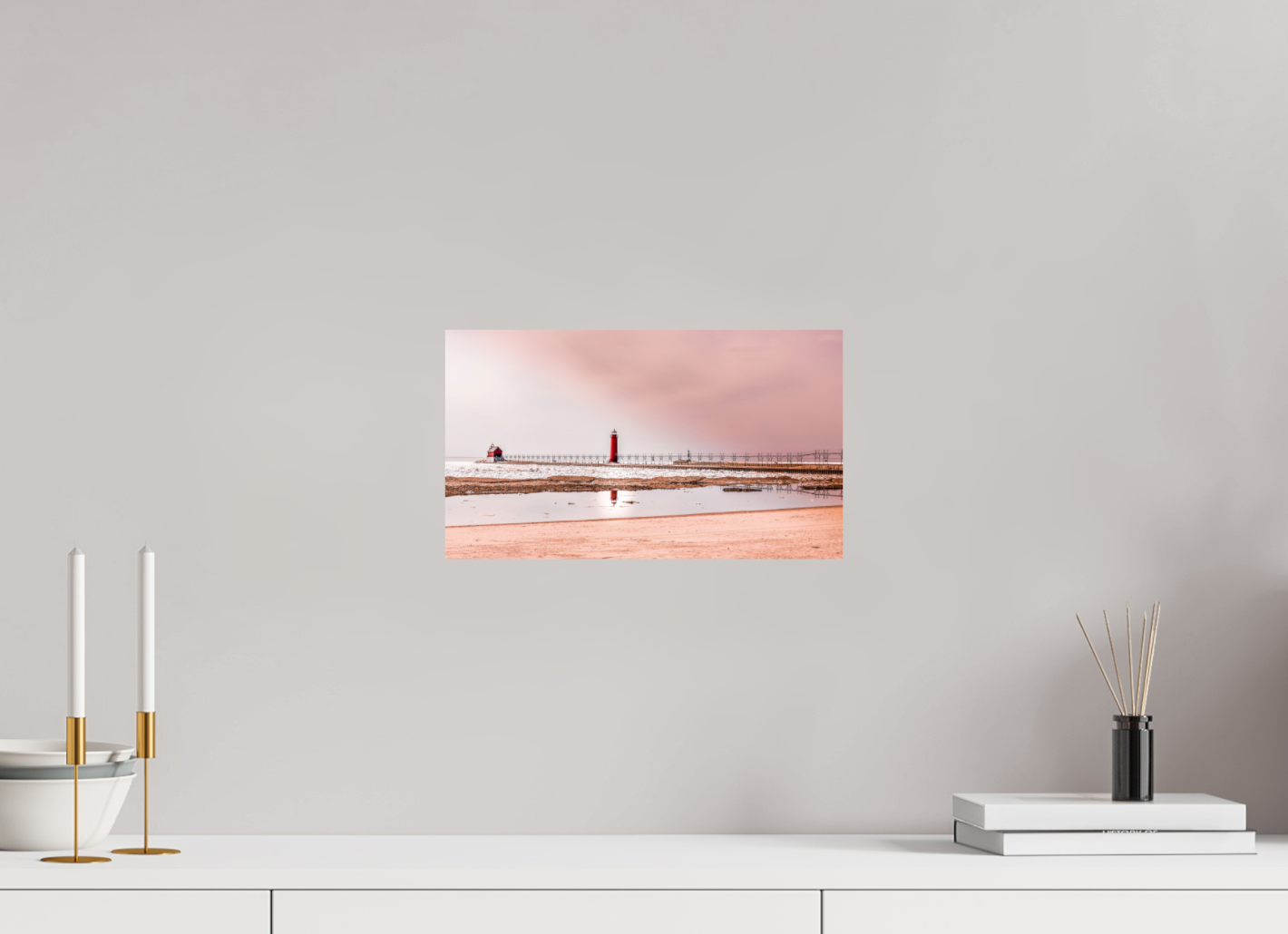 Immerse yourself in the serene beauty of the Grand Haven Pier with our stunning Fine Art Print photograph. Captured on an artistic, overcast day, this medium format image showcases the captivating interplay of frozen lakes and the gentle warmth of the beach as winter begins to melt away.