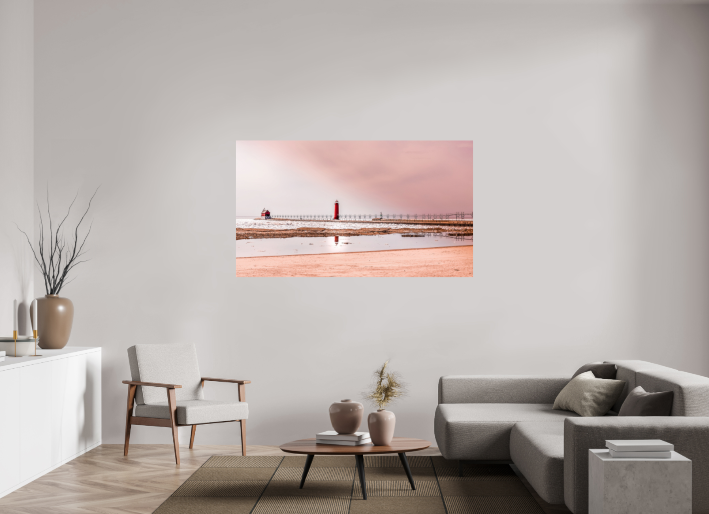 The Grand Haven Pier stands as a testament to nature's artistry, beautifully framed by the soft hues of winter's retreat. Each detail is painstakingly captured with the state-of-the-art X2D 100c camera, ensuring that every aspect of this breathtaking scene comes to life in your space.