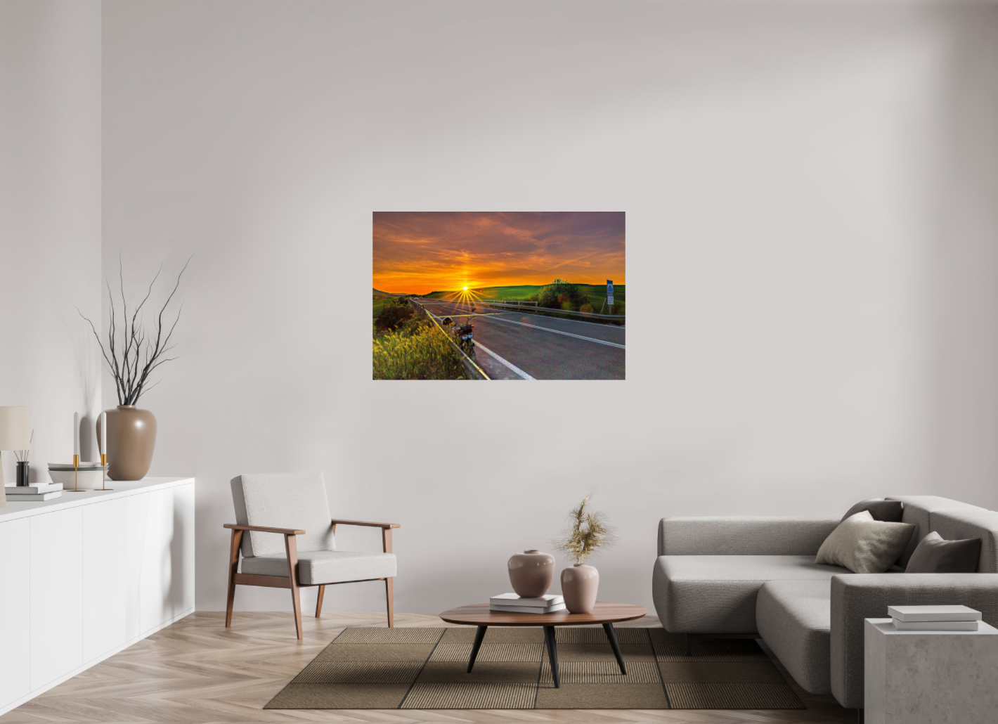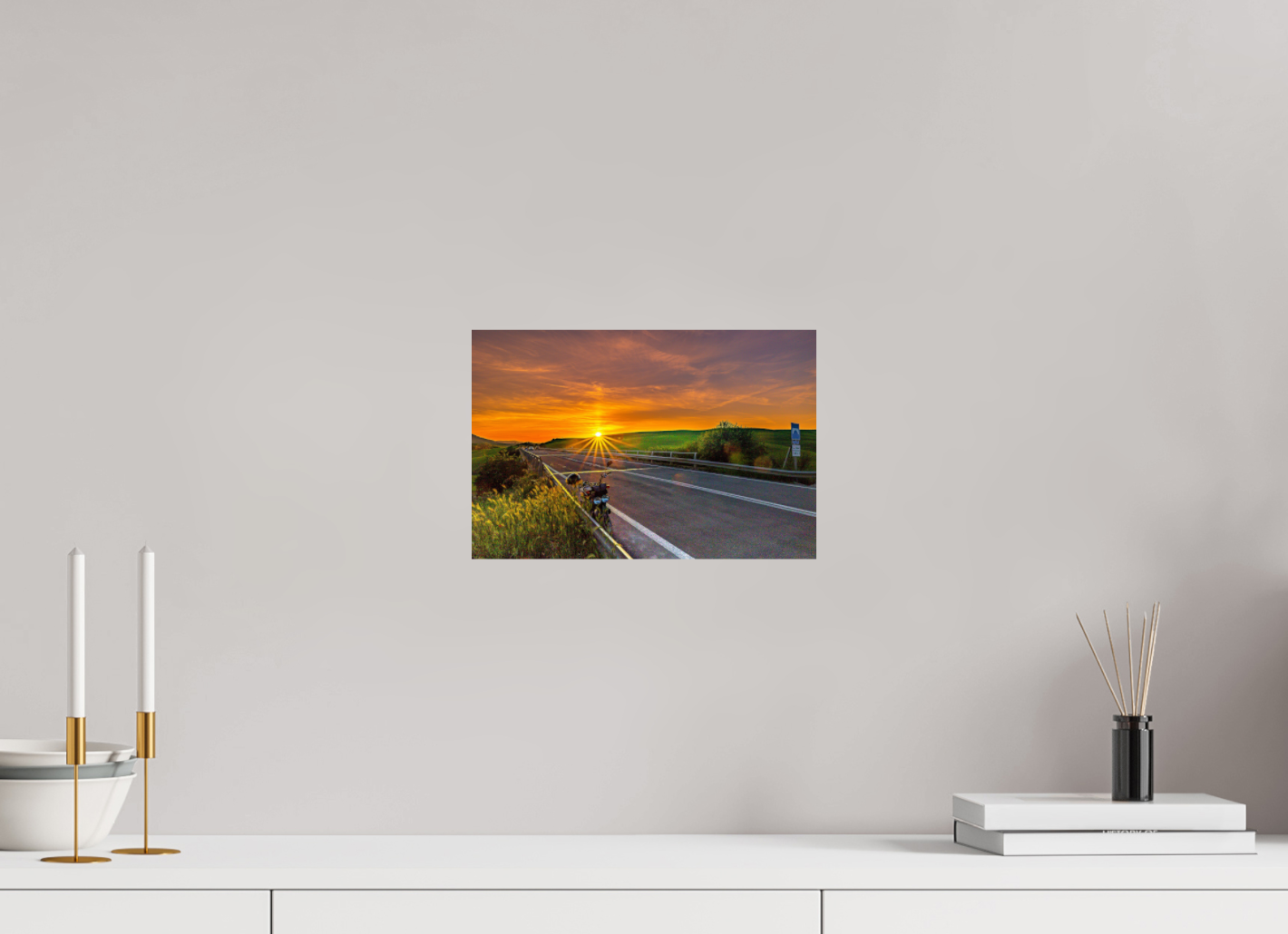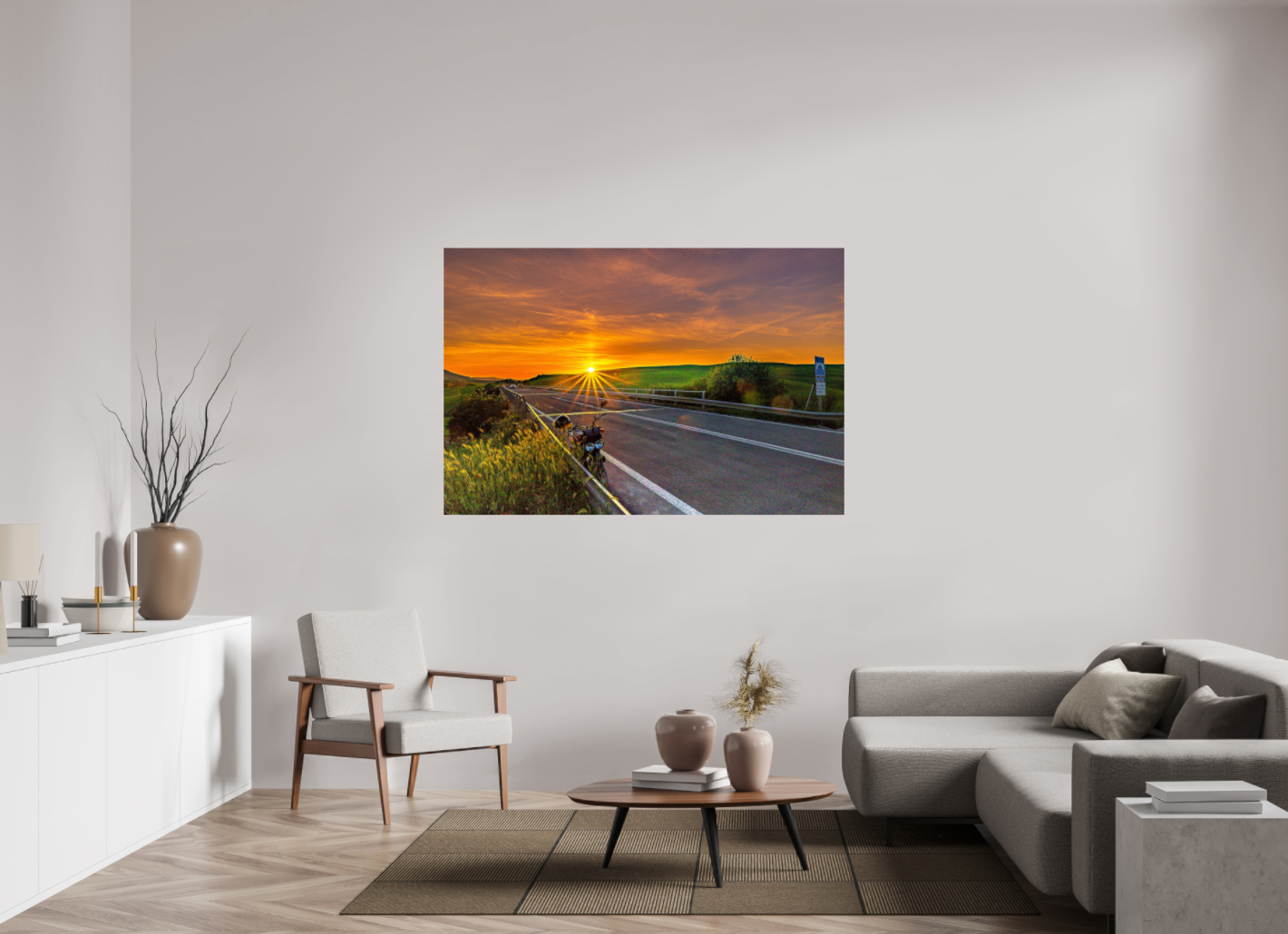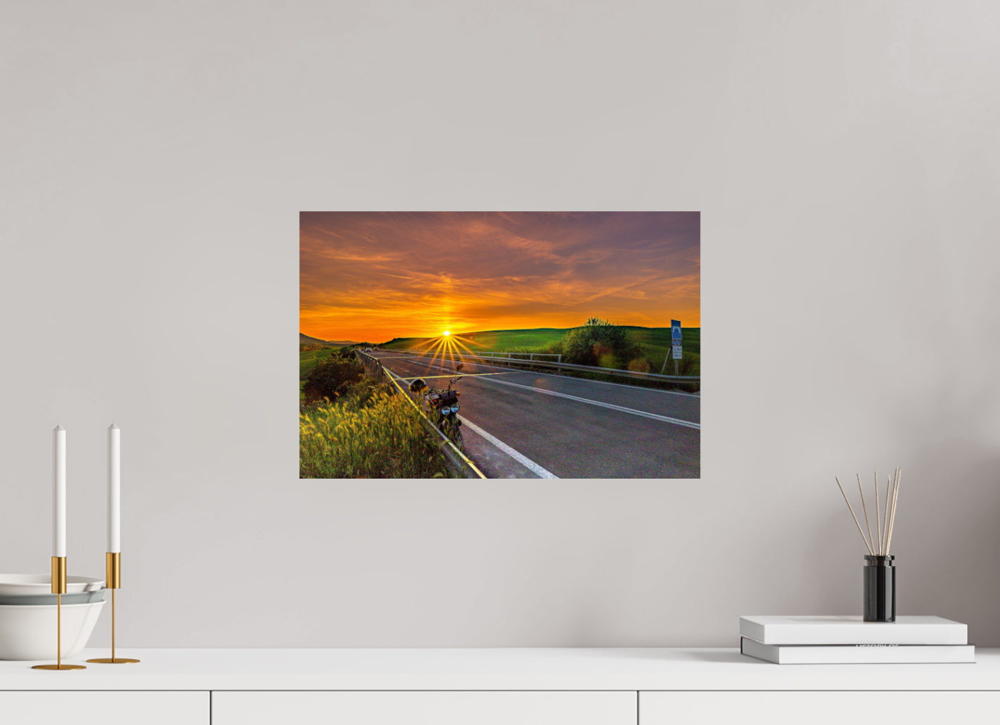 Experience the breathtaking beauty of a Sunset in Tuscany with this stunning fine art print that captures the essence of Italy's picturesque landscapes. This high-quality photograph features a charming Italian roadway that winds through the serene countryside, with a classic motorbike resting against the road barrier, inviting you to embark on a dreamlike journey.