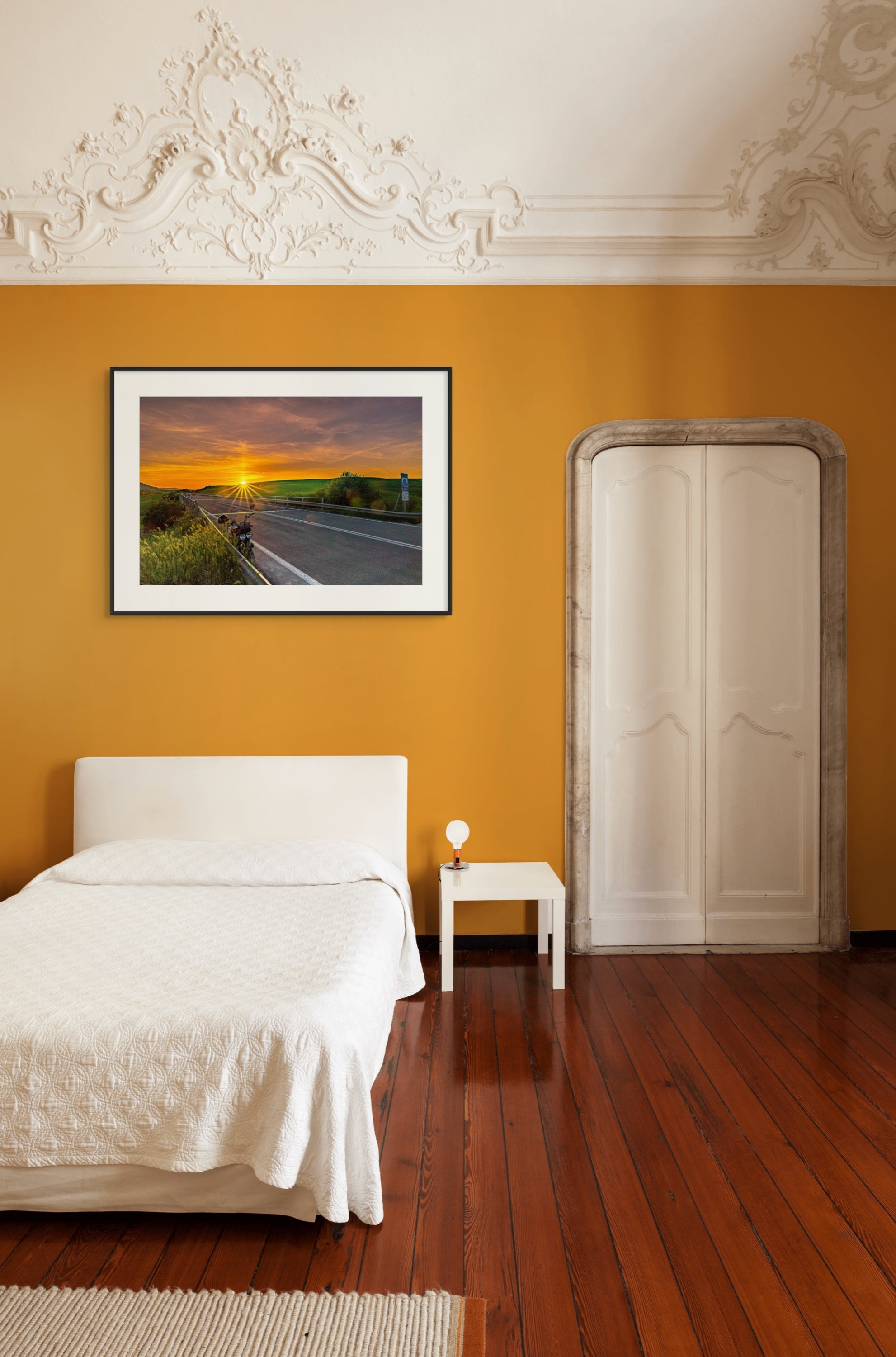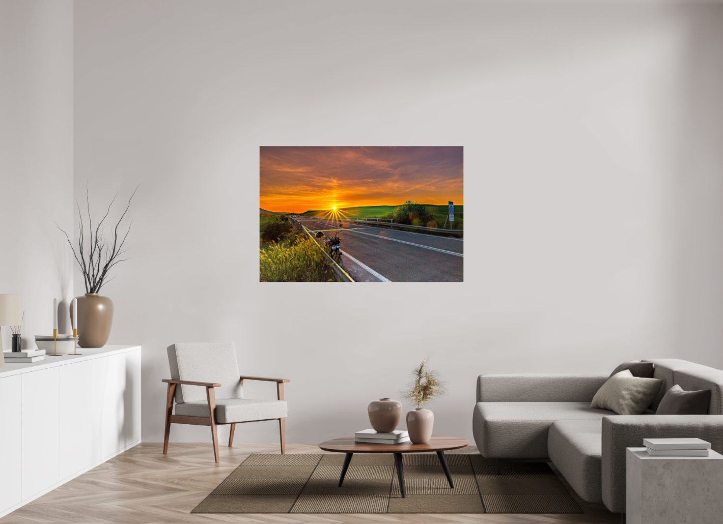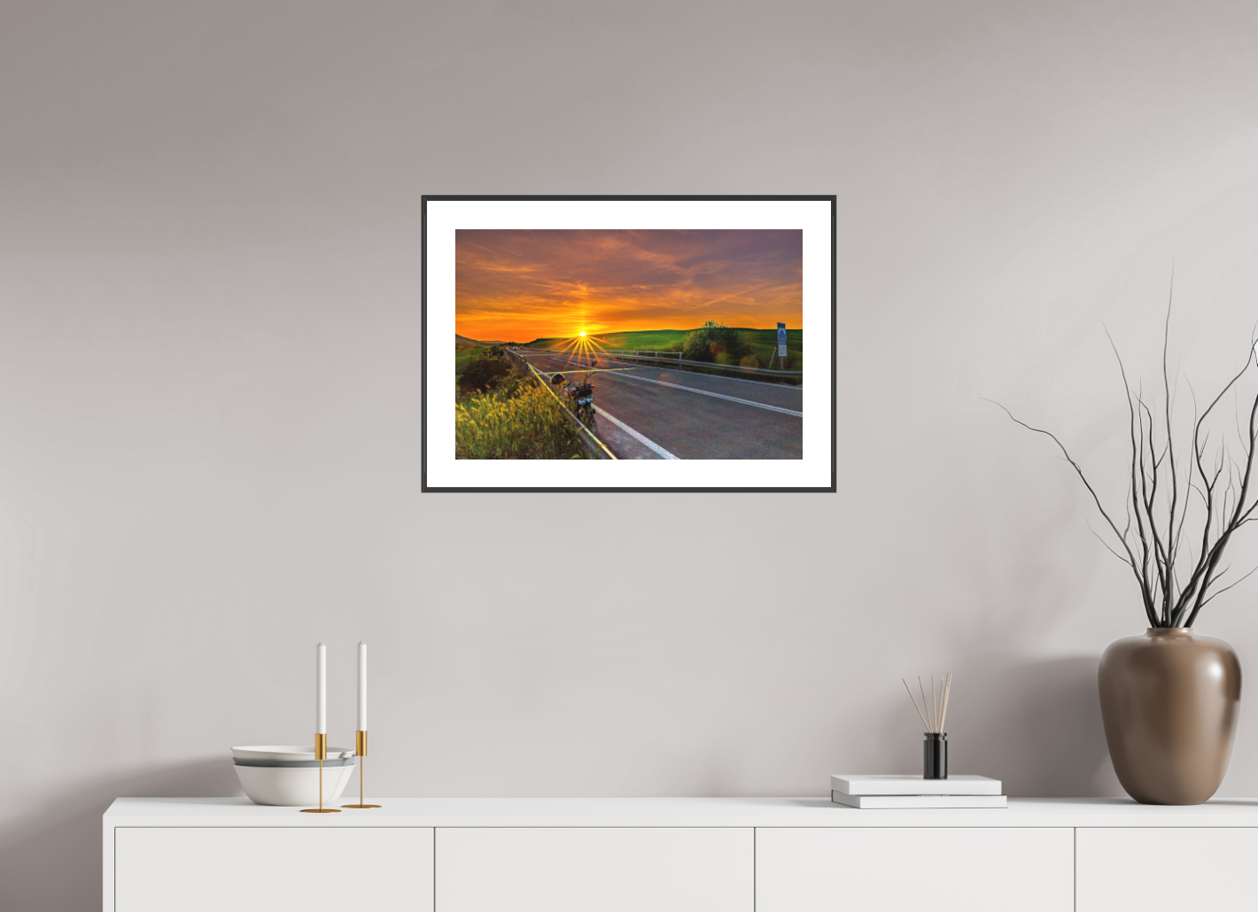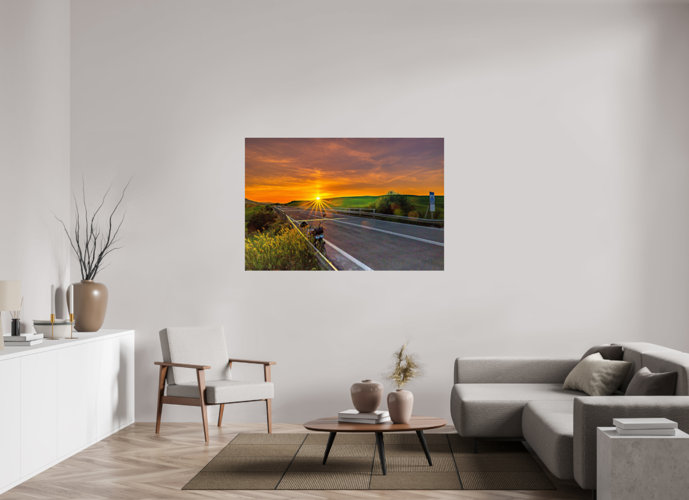 Experience the breathtaking beauty of a Sunset in Tuscany with this stunning fine art print that captures the essence of Italy's picturesque landscapes. This high-quality photograph features a charming Italian roadway that winds through the serene countryside, with a classic motorbike resting against the road barrier, inviting you to embark on a dreamlike journey.