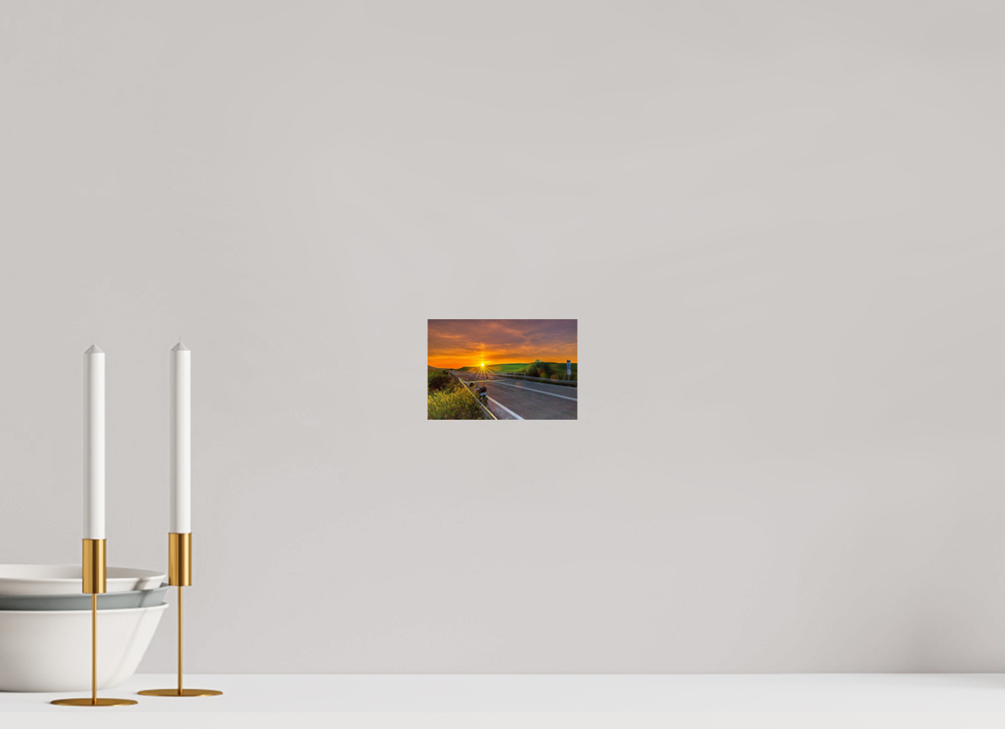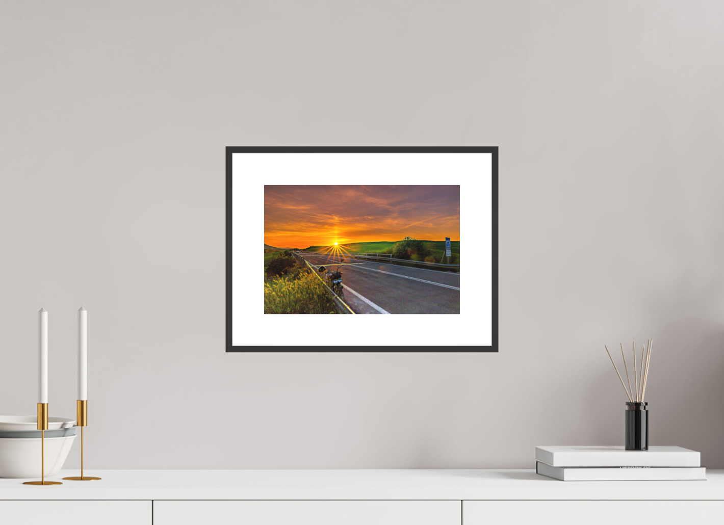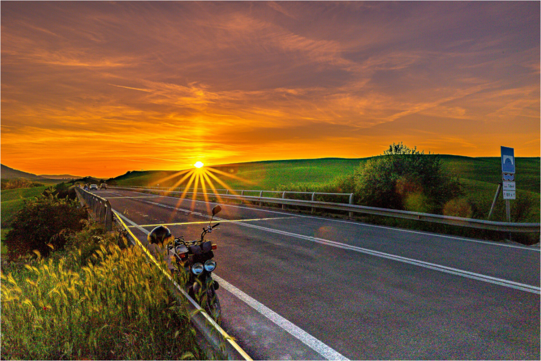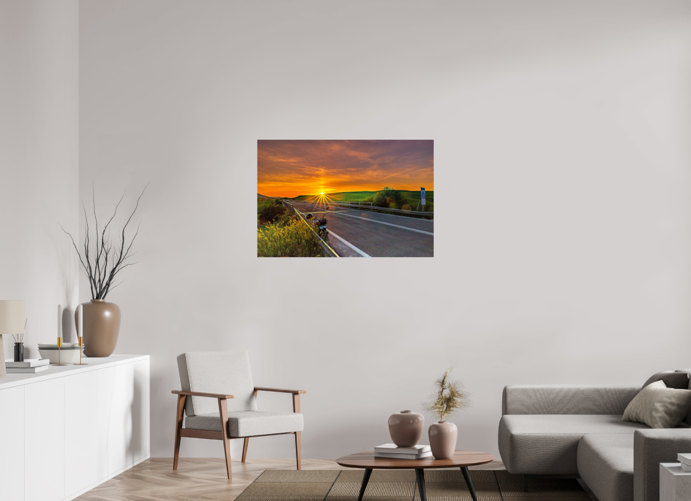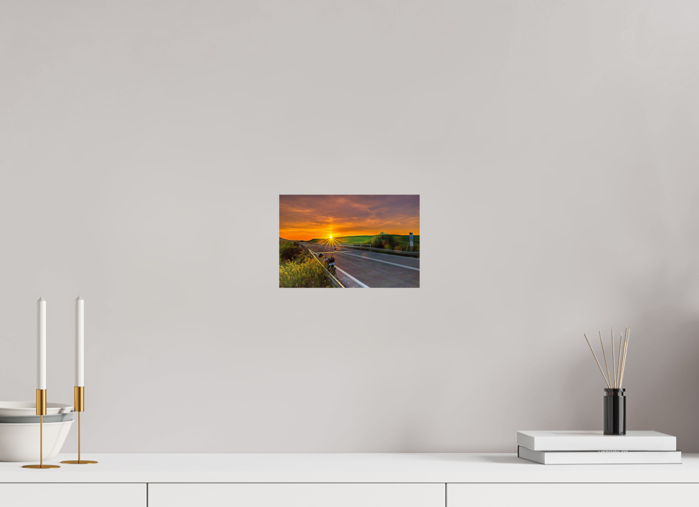 Experience the breathtaking beauty of a Sunset in Tuscany with this stunning fine art print that captures the essence of Italy's picturesque landscapes. This high-quality photograph features a charming Italian roadway that winds through the serene countryside, with a classic motorbike resting against the road barrier, inviting you to embark on a dreamlike journey.