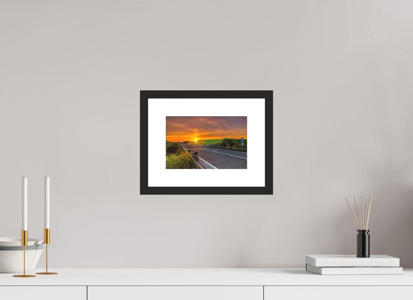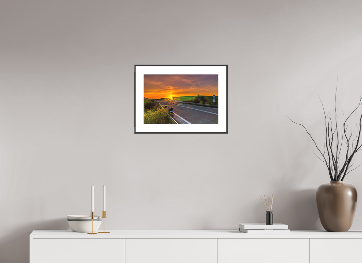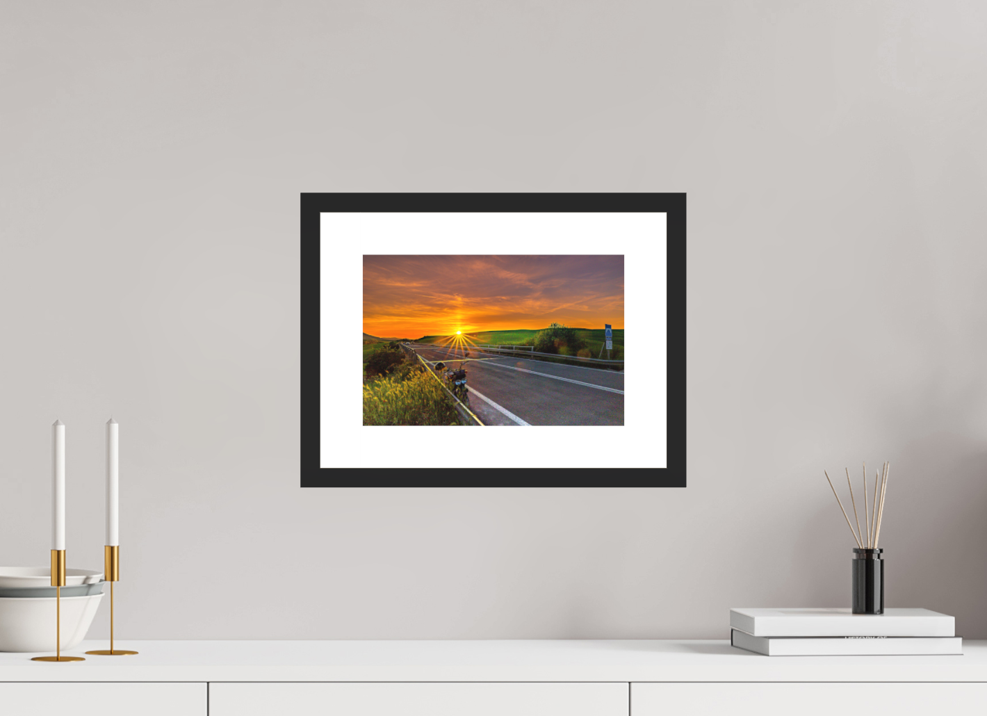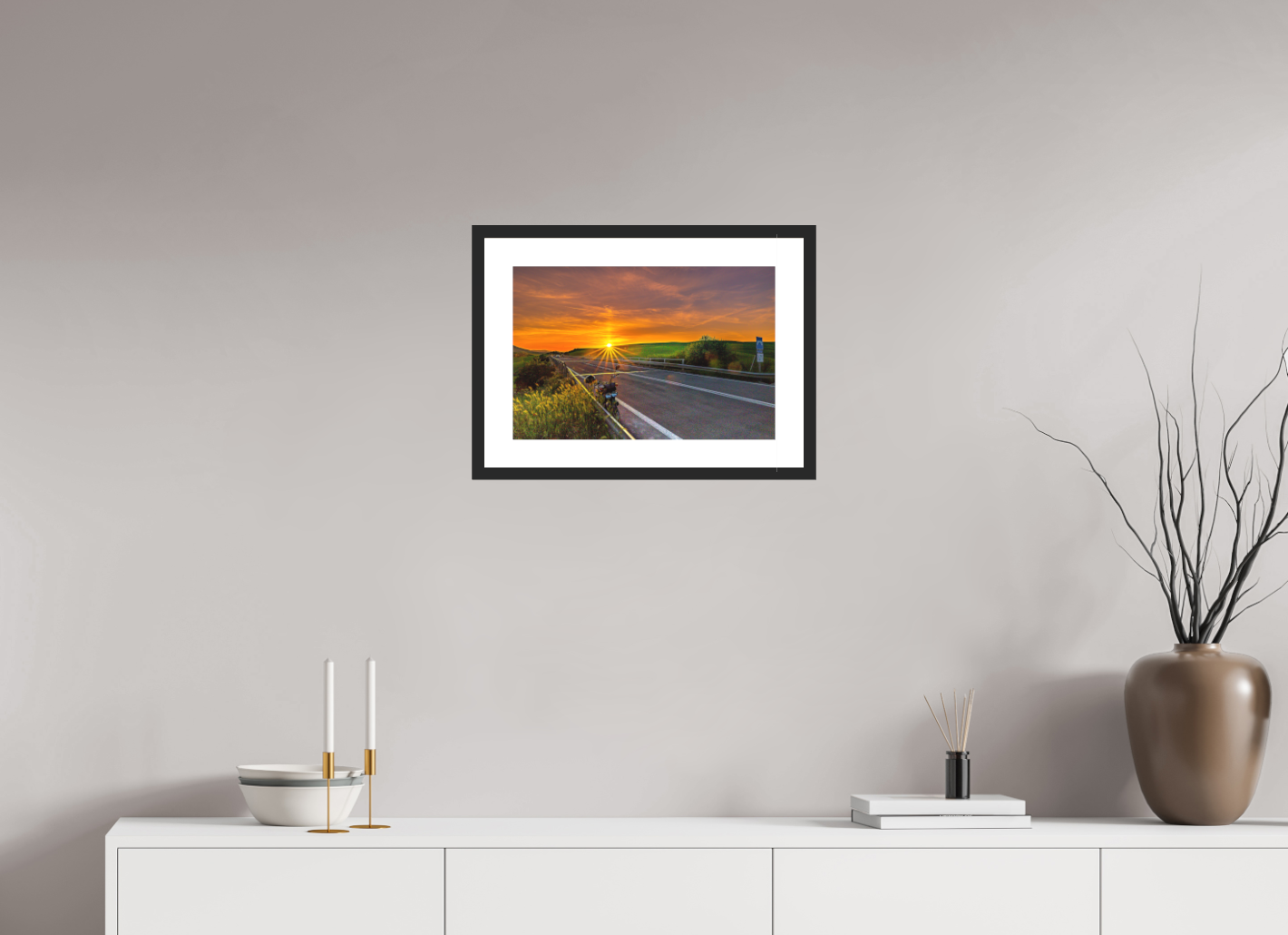 Experience the breathtaking beauty of a Sunset in Tuscany with this stunning fine art print that captures the essence of Italy's picturesque landscapes. This high-quality photograph features a charming Italian roadway that winds through the serene countryside, with a classic motorbike resting against the road barrier, inviting you to embark on a dreamlike journey.