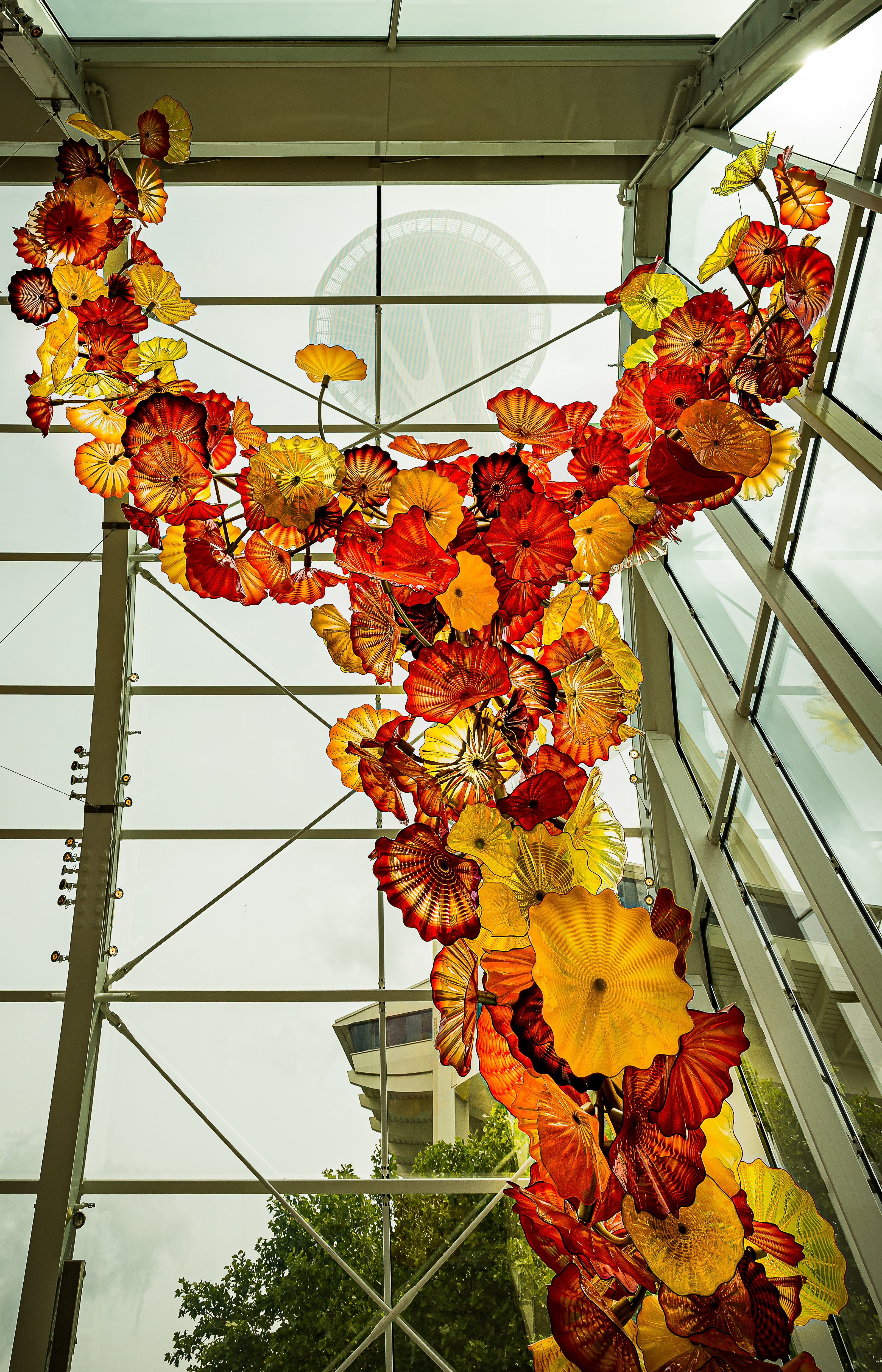 - Iconic Seattle Landmark: The Space Needle peeks through the artwork, blending modern architecture with artistic glass, making it a true representation of Seattle.