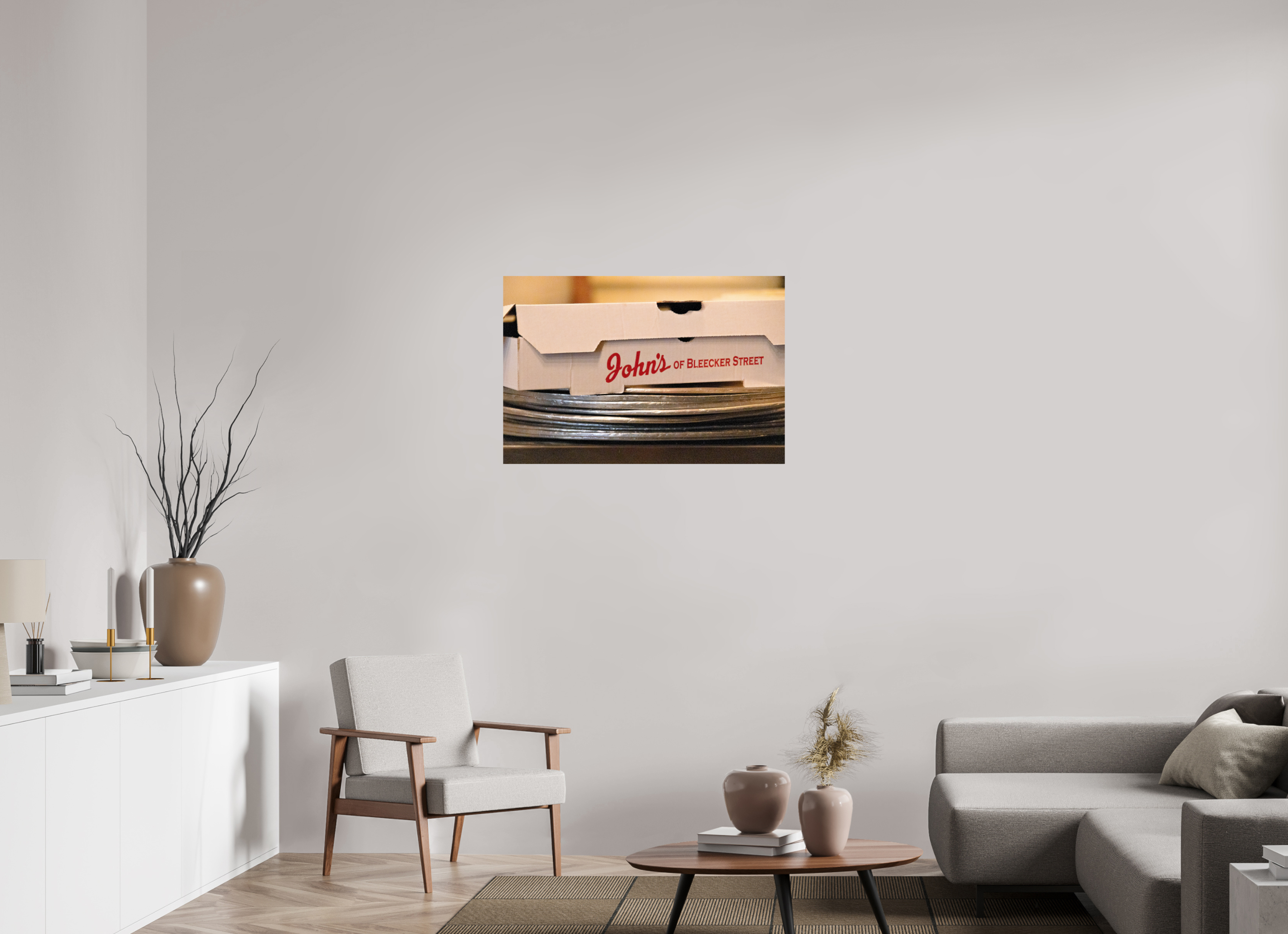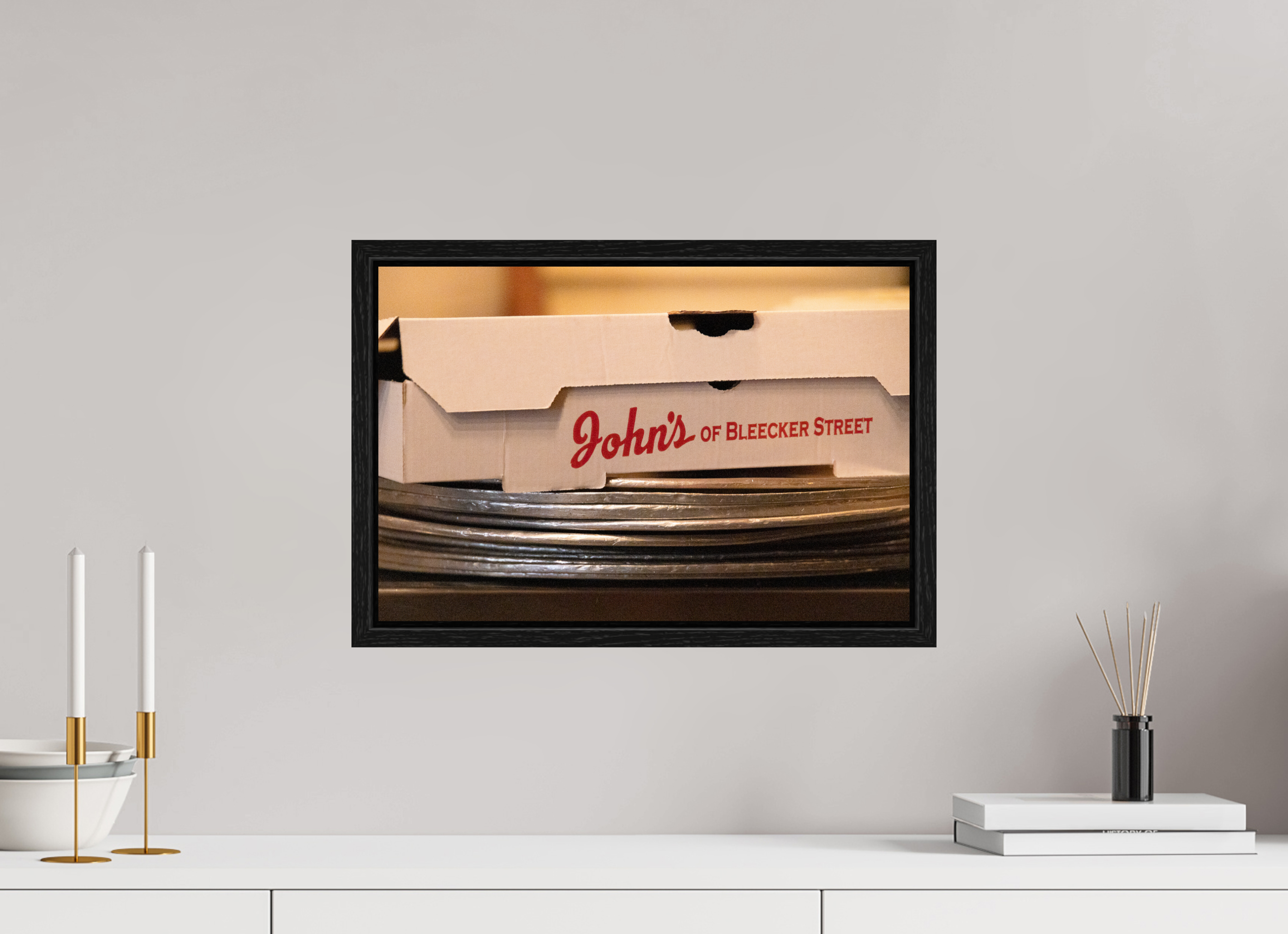 Transform your space with the stunning John’s of Bleeker fine art print photography. This exquisite piece captures the essence of the iconic pizzeria with a beautifully composed image of a box from John’s of Bleeker resting atop a stack of pizza pans, evoking nostalgia and a love for authentic New York cuisine.